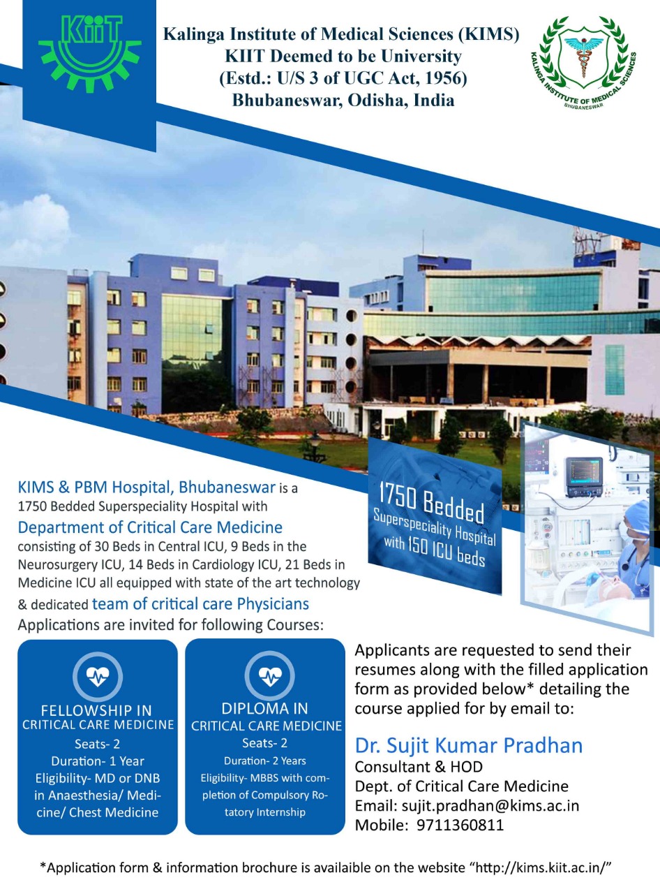 KIMS & PBM Hospital Bhubaneswar is a 1750 Bedded Superspeciality Hospital with independent Department of Critical Care Medicine consisting of 30 Beds in Central ICU, 9 Beds in the Neurosurgery ICU, 14 Beds in Cardiology ICU, 21 Beds in Medicine ICU all equipped with state of the art technology & dedicated team of critical care physicians.